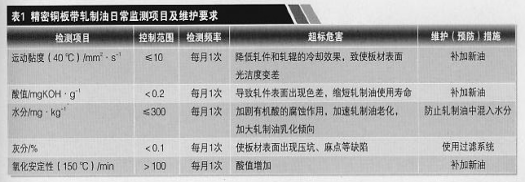 為了確保精密銅板帶軋制油的使用性能,良好的日常監(jiān)控和維護十分重要。這不僅有利于延長精密銅板帶軋制油的使用壽命,降低成本,而且有利于板材的表面質量和精度。精密銅板帶軋制油的常規(guī)性能指標包括運動黏度、閃點、傾點、水分、灰分、酸值、銅片腐蝕、餾程、最大無卡咬負荷、氧化安定性等,其日常監(jiān)測項目及維護要求見表1,換油指標要求見表2 。