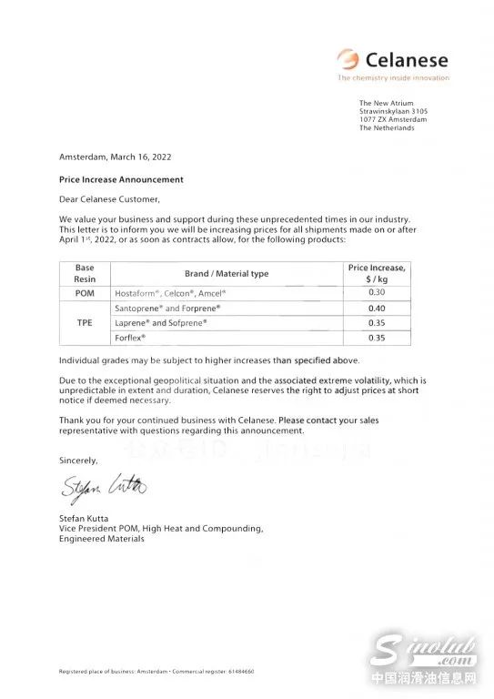 3月16日,塞拉尼斯發(fā)布調(diào)價(jià)通知函稱,將從4月1日起,提高公司部分系列POM(聚甲醛)、TPE(熱塑性彈性體)價(jià)格,最高漲幅高達(dá)400美元/噸!