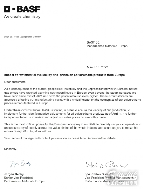 3月15日,巴斯夫發(fā)布客戶溝通函,將從4月1日起,對歐洲市場所有聚氨酯產(chǎn)品實(shí)施進(jìn)一步價(jià)格調(diào)整。