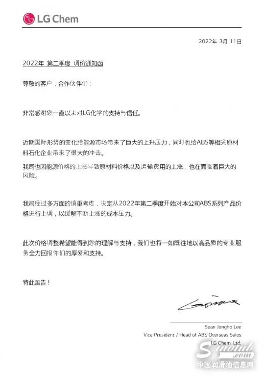 LG化學(xué)調(diào)價(jià)通知函稱,受國際形勢及能源上漲影響,自第二季度開始,公司將針對ABS系列產(chǎn)品進(jìn)行提價(jià)!