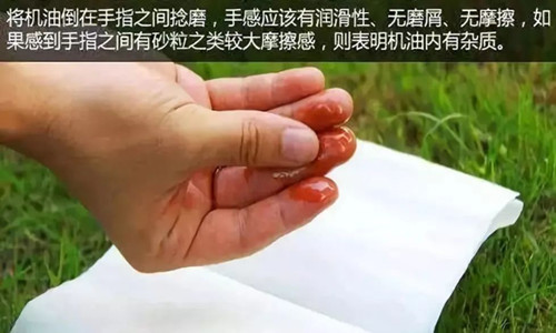 用大拇指與食指反復(fù)研磨潤滑油,可以通過感受潤滑油的潤滑性、摩擦程度、磨屑多少來判別,若有顆粒狀,滯澀感,則說明油品有問題不能用,應(yīng)及時更換。