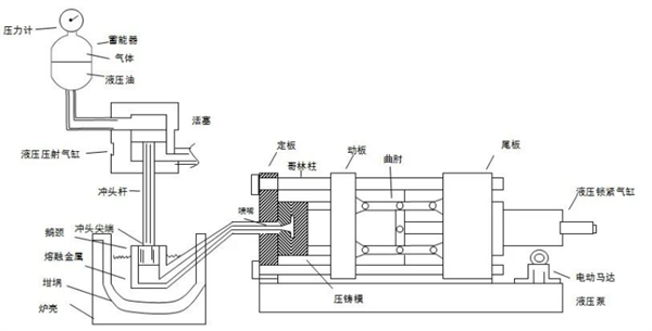 壓鑄設備將電機的電能通過馬達轉(zhuǎn)換為泵的液壓能,從而進行動作(即打開和關(guān)閉模具以及噴射熔化金屬進入模具型腔)。