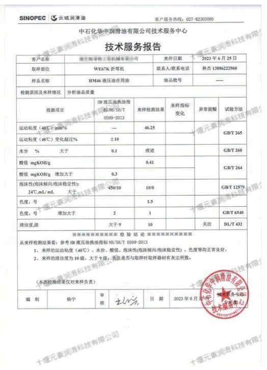 果不其然,6月27日《技術服務報告》出來后,對比NB/SH/T 0599-2013 L-HM《液壓油換油標準》,顯示該在用油的運動粘度、水分、酸值、泡沫傾向性正常良好,唯一清潔度超標了1級(為NAS10級),分析判斷可能是抽取油樣過程中的污染所致,并不影響油品質(zhì)量,能滿足此設備繼續(xù)使用要求。