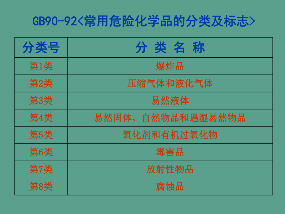 常用危險化學(xué)品在《常用危險化學(xué)品的分類及標志(GB 13690-92)》中按危險特性分為8類:(順序和危險等級沒有關(guān)系)