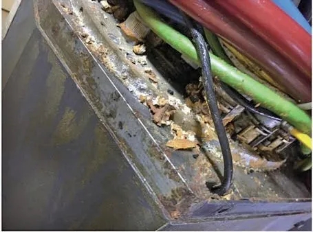設(shè)備廠家維修拆開主軸內(nèi)部發(fā)現(xiàn),各種電氣管線都附著一些黃褐色物質(zhì),金屬表面已出現(xiàn)銹蝕現(xiàn)象,部分電氣管線外層膠皮已腐蝕硬化脫落,個(gè)別管線內(nèi)部已進(jìn)入切削液,故障分析之后發(fā)現(xiàn)與切削液有關(guān)。因?yàn)橹鬏S管線內(nèi)部結(jié)構(gòu)復(fù)雜且腐蝕程度已造成故障隱患,需要對(duì)管線整體進(jìn)行更換,但機(jī)床配件進(jìn)口周期較長(zhǎng),造成長(zhǎng)時(shí)間停機(jī)維修,損失較大。