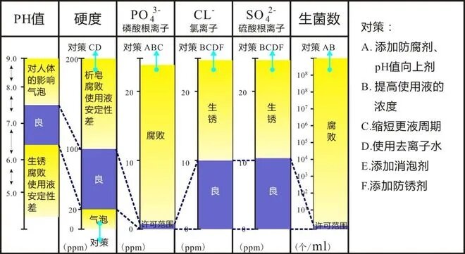當(dāng)pH值<8.5時,同時切削液還有異味,這時需要立即進行殺菌處理,查明原因并制定合理的解決方案。