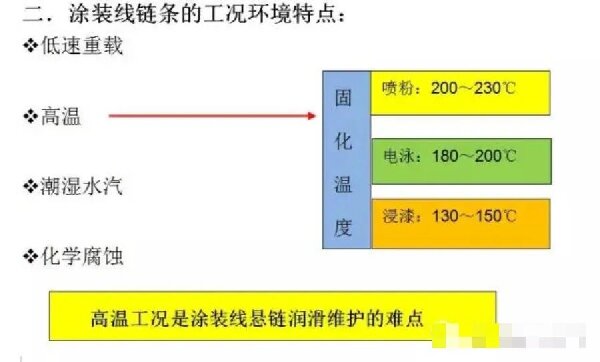 工件表面涂漆后,要進(jìn)入烘爐烤漆,也就是說(shuō),懸掛輸送鏈需要反復(fù)進(jìn)入高溫區(qū),每次進(jìn)入高溫區(qū)的時(shí)間約幾十分鐘。這就要求鏈條用潤(rùn)滑劑應(yīng)滿足: