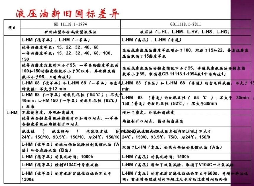 國外比較有代表性的礦油型液壓油國家標(biāo)準(zhǔn)有德國的DIN51524(Ⅰ、Ⅱ、Ⅲ),分類為HL、HLP和HVLP(HL、HM、和HV),法國的NFE48603,它們代表抗磨液壓油的一般水平。