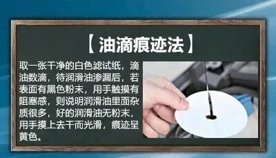 取一張干凈的白色濾試紙,滴油數(shù)滴,待潤(rùn)滑油滲漏后,若表面有黑色粉末,用手觸摸有阻塞感,則說(shuō)明潤(rùn)滑油里面雜質(zhì)很多,好的潤(rùn)滑油無(wú)粉末,用手摸上去干而光滑,痕跡呈黃色。