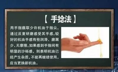 將潤(rùn)滑油捻在大拇指與食指之間反復(fù)研磨,較好的潤(rùn)滑油有潤(rùn)滑性、磨屑少、無(wú)摩擦;若感到手指之間有砂粒之類較大摩擦感,則表明潤(rùn)滑油內(nèi)雜質(zhì)多,不能再用,應(yīng)更換新潤(rùn)滑油。
