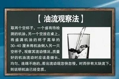 取兩只量杯,其中一個(gè)盛有待檢查的潤(rùn)滑油,另一只空放在桌面上,將盛滿潤(rùn)滑油的量杯高舉離開(kāi)桌面30~40厘米并傾斜,讓潤(rùn)滑油慢慢流到空杯中,觀察其流動(dòng)情況。質(zhì)量好的潤(rùn)滑油油流細(xì)長(zhǎng)、均勻、連綿不斷;若出現(xiàn)流速忽快忽慢,時(shí)而有大塊流下,則說(shuō)明潤(rùn)滑油已變質(zhì)。