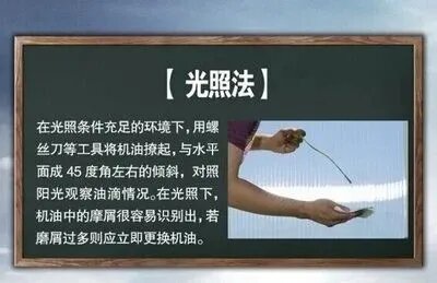 在天氣晴朗的日子,用螺絲刀將潤(rùn)滑油撩起,與水平面成45度角,對(duì)照陽(yáng)光,觀察油滴情況。光照下,可清晰看到潤(rùn)滑油中無(wú)磨屑者為良好;若磨屑過(guò)多,則應(yīng)更換。